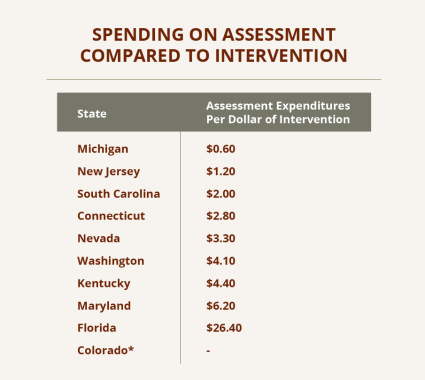 Resources, including personnel, are especially problematic at the state level owing to an ongoing decline in funds available to support education initiatives. Further, available funds are linked to specific programs and often are focused more on assessment than intervention, and the recruitment and development of talented personnel falls victim to the structure of the state system. Johnson, Oliff and Williams (2011) noted that between 2008 and 2011, 34 states had substantially cut education budgets, with very few anticipating increases through the 2013 school year. Jochim and Murphy (2013) call additionally problematic the fact that state budgets are developed and reported by program or organizational division, a practice that inhibits strategic allocation of resources when different program areas share similar strategic priorities. For example, departments concerned with bilingual education and with special education share a priority around supporting schools to be culturally responsive, but each has separate funds and personnel to carry out those activities, creating potentially overlapping efforts rather than shared and strategic offerings. And, even as the role of the state expanded from a focus on compliance to include supports for intervention, state funding is still allocated disproportionately toward efforts to assess and evaluate rather than intervention or capacity building. This table shows the ratio of assessment to intervention dollars spent by states (Jochim & Murphy, 2013, p. 7).